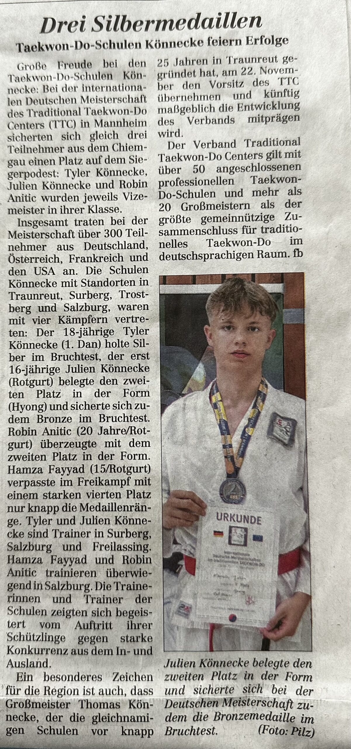 Quelle: Traunreuter Anzeiger, 30.7.2025 Schüler der Taekwon-Do Schulen Könnecke auf dem Podest